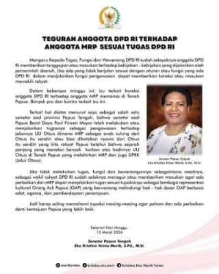 Deiyai (NP) – Senator dari Dewan Perwakilan Daerah Republik Indonesia (DPD RI) asal Papua Tengah, Eka Kristina Yeimo Murib, menegaskan bahwa teguran atau koreksi yang disampaikan anggota DPD RI kepada anggota Majelis Rakyat Papua (MRP) merupakan bagian dari tugas dan fungsi pengawasan lembaga perwakilan daerah.